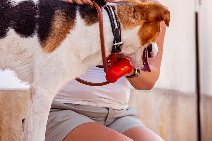 Handlicher und leicht zu tragender Taschenspender, der mit dem Haken an Ihrer Leine, Ihrem Gürtel oder Ihrer Handtasche befestigt werden kann.