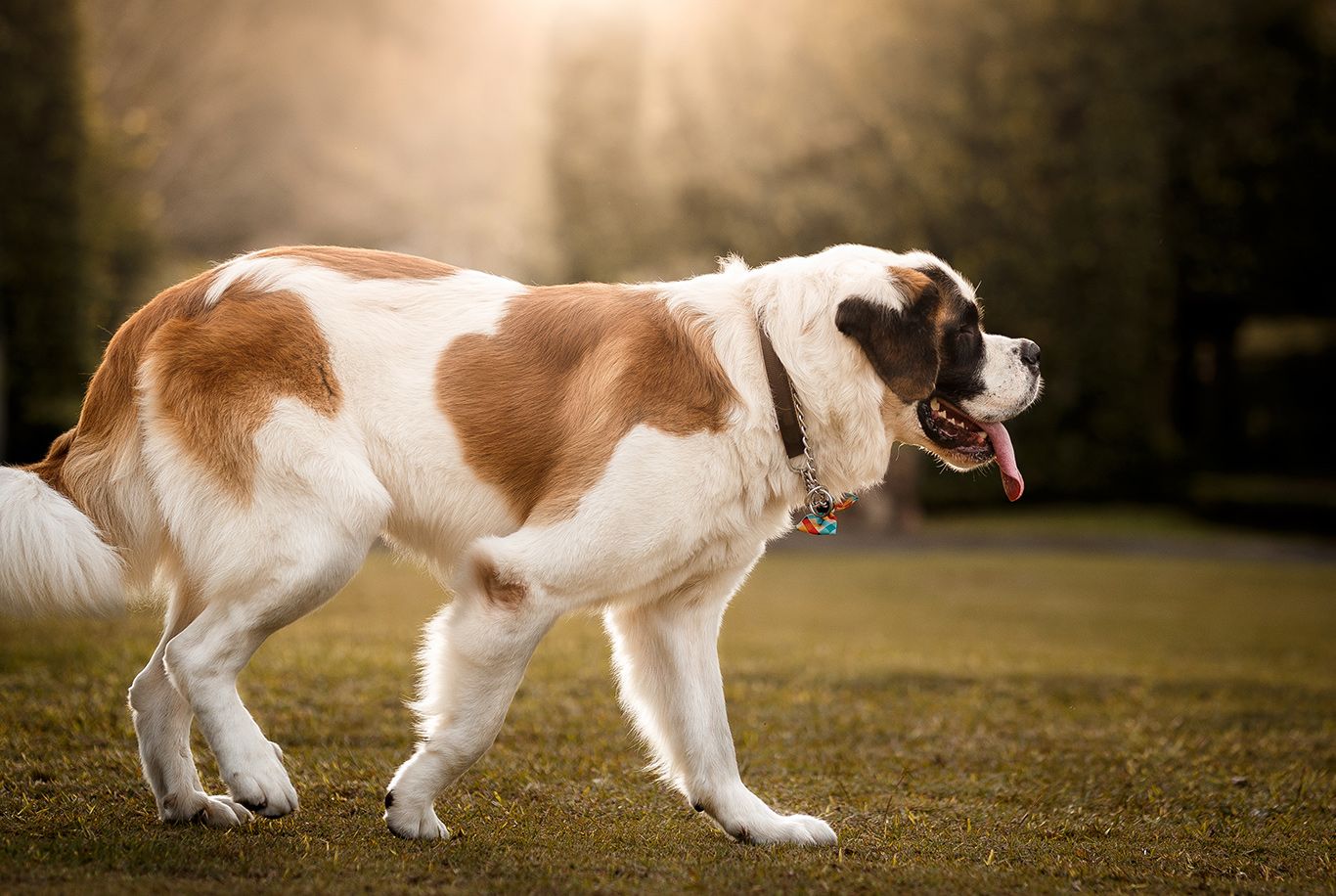 Sie können erkennen, dass es sich um einem Bernhardiner handelt, nicht nur an der Größe des Tieres, sondern auch an der Farbe des Fells. Das Bernhardinerfell ist normalerweise dreifarbig, großteils mit Braun- und Kupfertönen mit weißem Bauch, Brust, Pfoten und Teilen der Schnauze. Der Bernhardiner hat einen massiven Kopf, eine breite Schnauze mit ausgeprägten Flügeln und dreieckigen Ohren, die an den Seiten des Kopfes hängen. Er hat eine tiefe Brust, starke Beine mit großen Pfoten und einen langen, haarigen Schwanz.