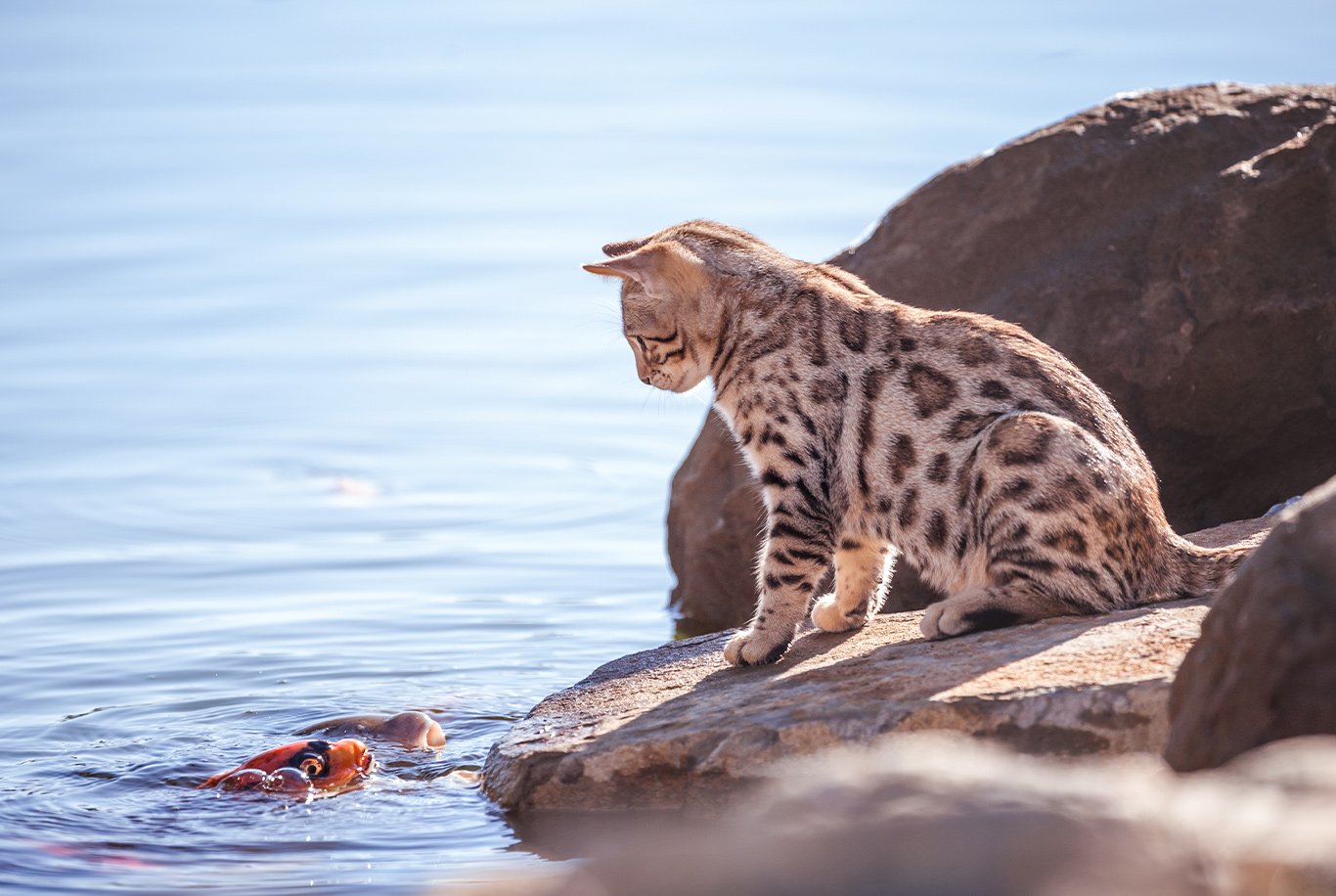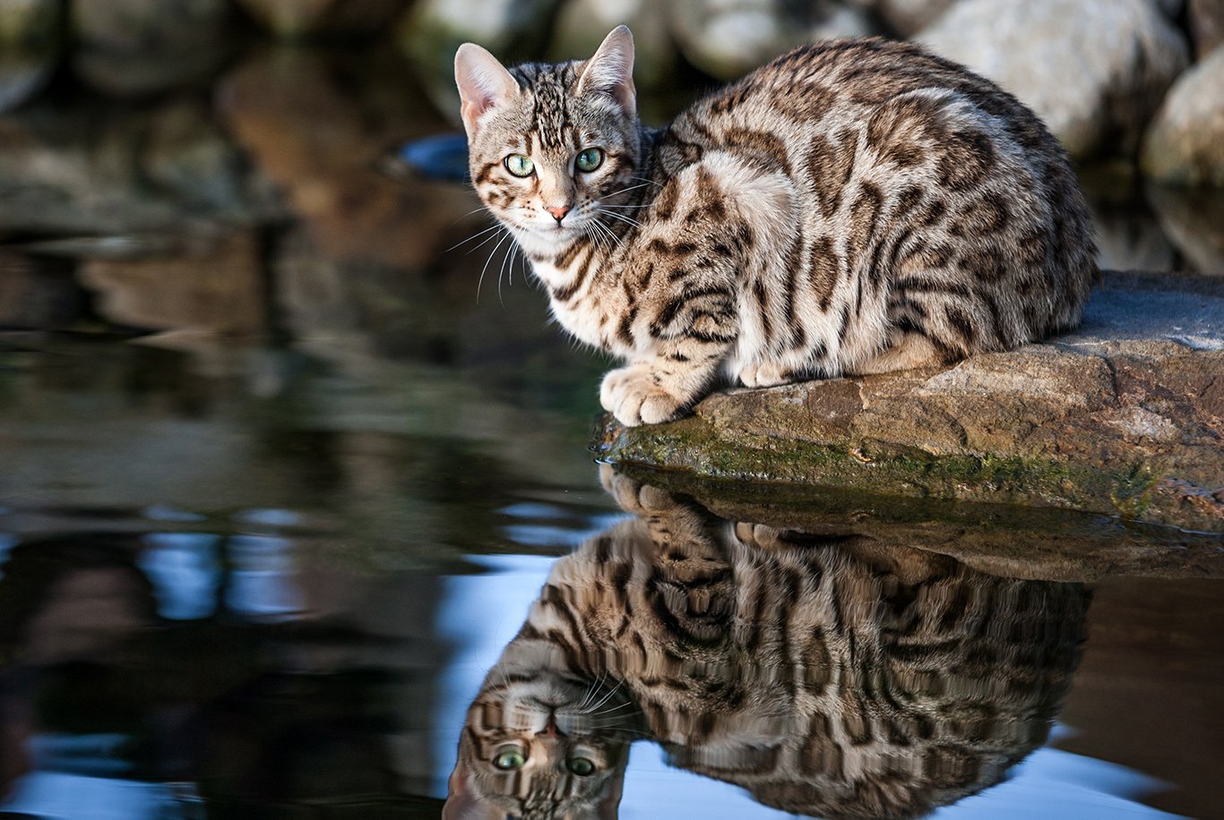 Aufgrund ihrer Abstammung von Wildkatzen sind Bengalen eine sehr aktive, agile und energiegeladene Katzenrasse, die eine Herausforderung darstellen kann. Sie brauchen viel körperliche Aktivität, wie z.B. Apportieren, Klettern in alle erreichbaren Höhen oder sogar Schwimmen. Unterforderte Bengalkatzen können unerwünschte und sogar zerstörerische Angewohnheiten entwickeln. Da diese Katzen recht flinke Pfoten haben, können sie sich leicht umdrehen, um nach persönlichen Gegenständen zu greifen oder Dinge von Tischen oder Regalen im Haus herunterzureißen. Bengalkatzen sind sehr wasserliebend. Stellen Sie daher sicher, dass sie keinen Zugang zu Aquarien oder Teichen haben, da Ihre Katze gerne versuchen wird, nach Lebewesen zu fischen. Sie können sogar erwarten, dass Ihre Bengalkatze häufig mit Ihnen in die Badewanne oder Dusche geht.